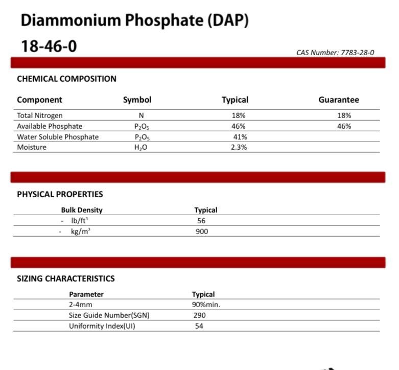 DAP : It is one of the most widespread and consumption fertilizers worldwide. It contains two essential nutritional sources for plant nutrition and growth: 46% phosphorus and 18% nitrogen. By virtue of its high percentage of phosphorus and nitrogen, it is considered an ideal option for improving the productivity of agricultural crops and enhancing their growth.